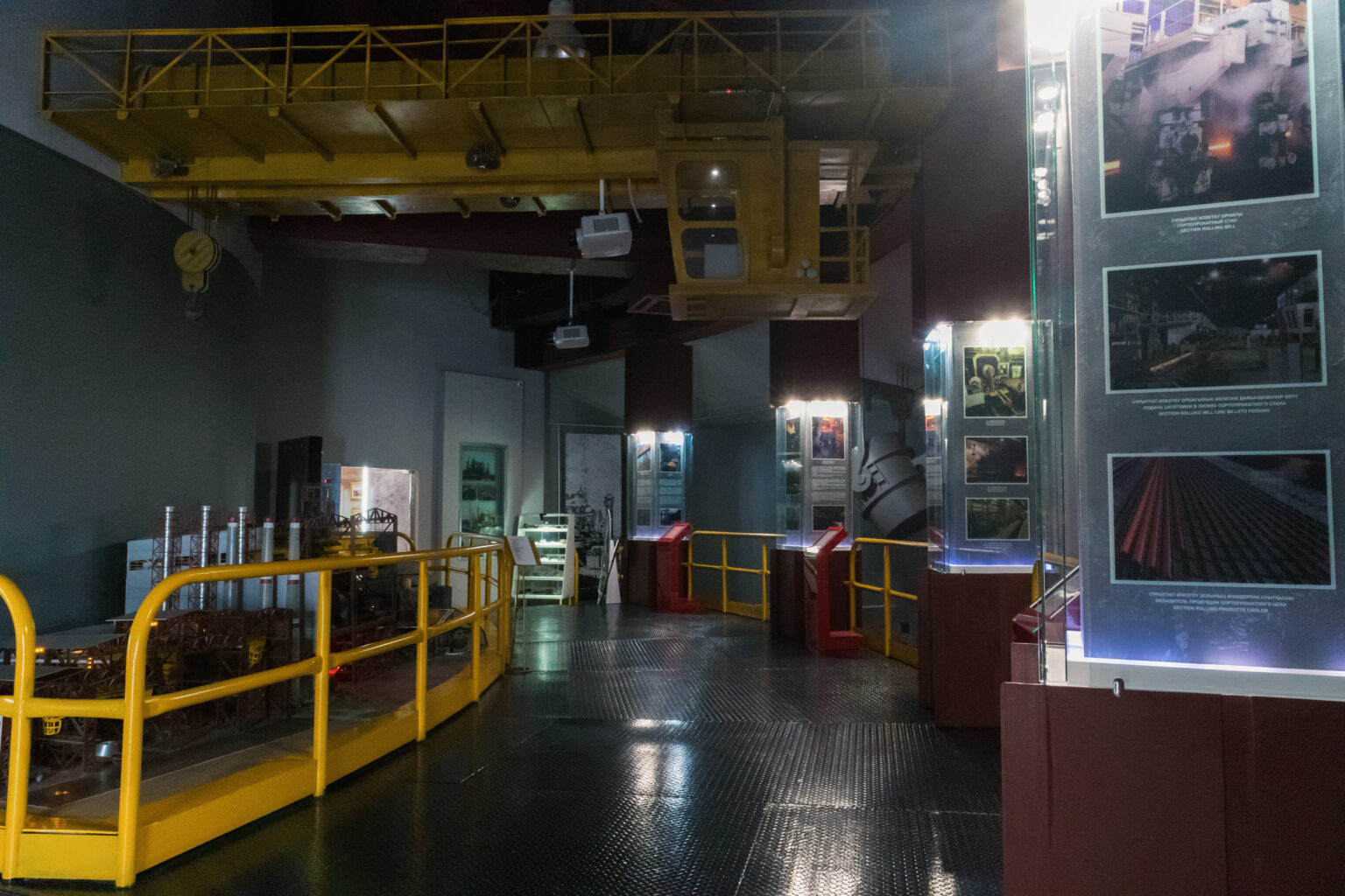 Залдың сол жағында қаңылтақтар мен дайын илемделген темір бұйымының макеттері ұсынылған, одан әрі - «АрселорМиттал Теміртау» АҚ жұмысшысының арнайы киімі.