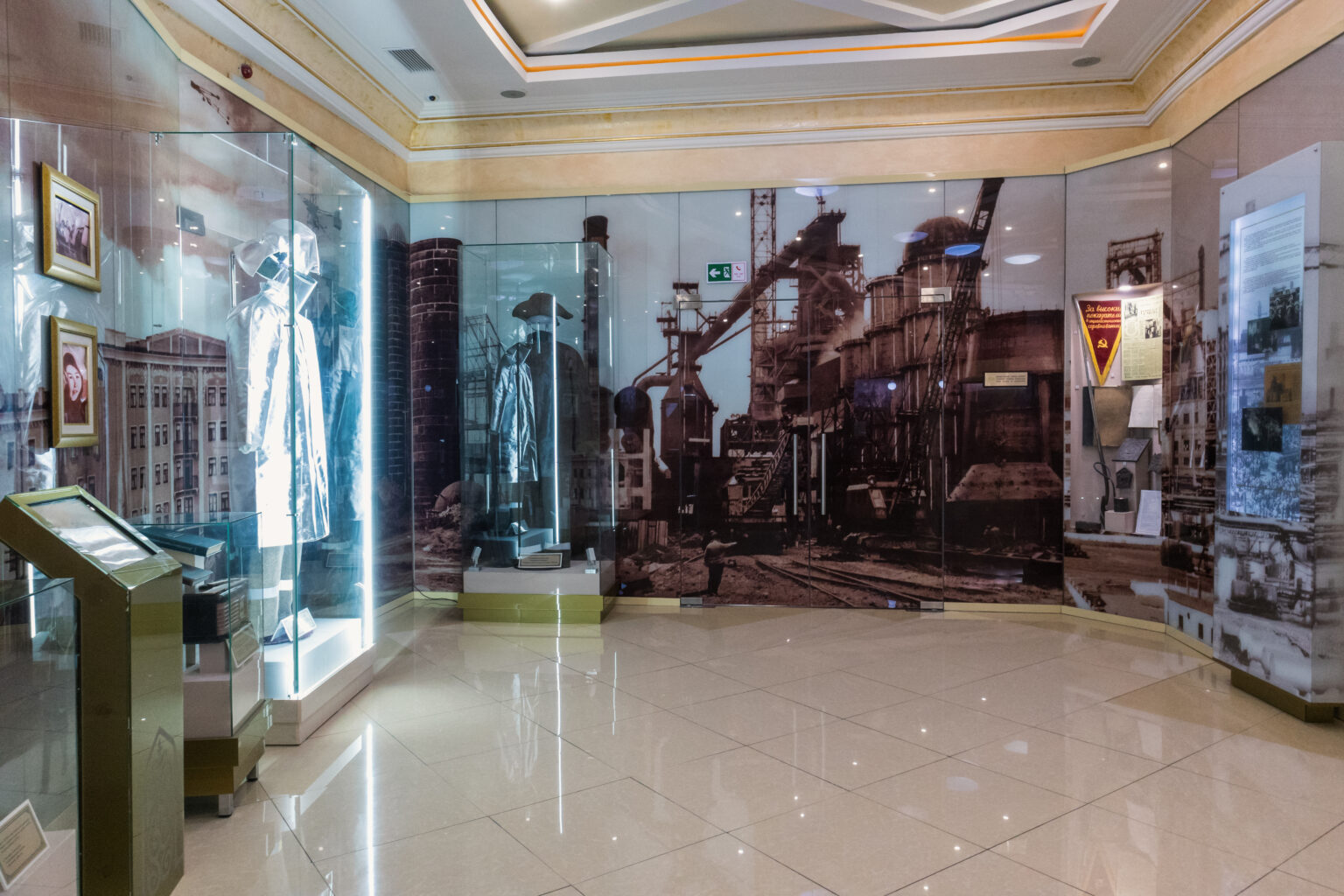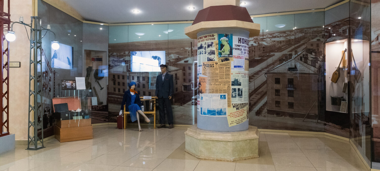 Витриналардағы фотосуреттер алып металлургиялық кәсіпорынның құрылысы туралы баяндайды. Залда өткен ғасырдың 50-ші жылдарындағы газеттер мен плакаттар ілінген жарнамалық қысқа бағана тұр. Сондай-ақ витриналарға Қазақстан Магниткасының құрылысшылары бос уақытында пайдаланатын заттары: Н.Назарбаев пен оның курстастары бірігіп сатып алған шахмат; домбыра, сырнай және 1958 жыл үлгісіндегі фотоальбом бар.