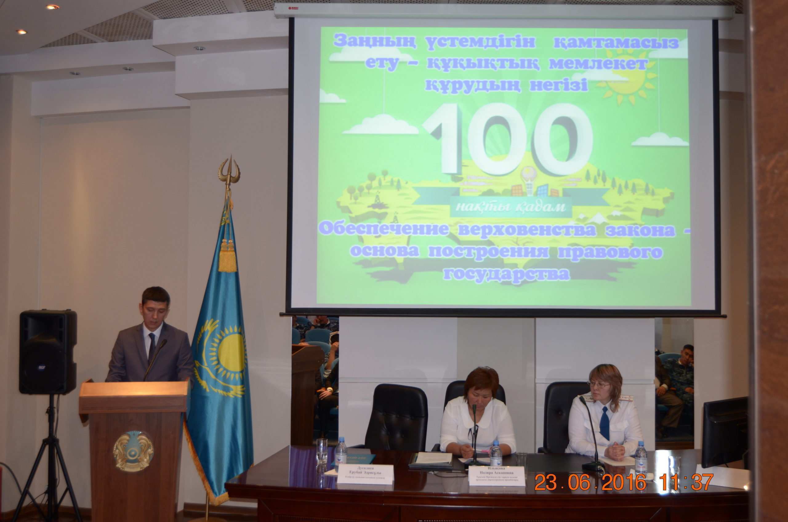 В ходе мероприятия вниманию участников был представлен видеоролик о Плане нации «100 конкретных шагов по реализации 5 институциональных реформ». Затем с докладом на тему «Роль органов внутренних дел по защите интересов людей и укрепления правопорядка» выступила инспектор управления внутренних дел Рахматулина Ж.Т. Доклад «Независимое правосудие - гарант обеспечения прав и свобод граждан» сделал судья городского суда Дусалиев Е.Э. Затем представители правоохранительных органов, участвовавщие в семинаре, обменялись мнениями. В завершение представителям управления внутренних дел и городского суда, которые внесли достойный вклад в дело пропаганды Плана нации Елбасы, были вручены Благодарственные письма Историко-культурного центра Первого Президента.